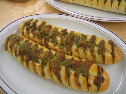 Den Baguettebroten die Oberfläche schräg bis knapp an den unteren Rand einschneiden (das Brot muss immer noch zusammenhalten)