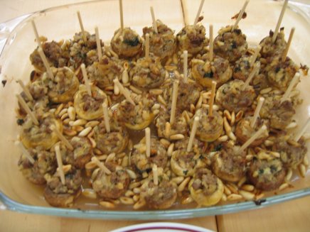 Die Pinienkerne in einer trockenen beschichteten Pfanne hellbraun rösten und über die fertigen Pilze streuen. Die Pilze nach Belieben mit etwas Peterli und Oregano garnieren und sofort servieren.