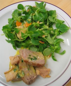 Thunfischfilets weiss, aus der Dose, zerzupft, Nüsslisalat Steaks in 1 – 2 cm breite Scheiben schneiden, Fisch und Fleisch ohne Dressing auf Tellern anrichten. Nüsslisalat daneben verteilen. Alles mit Dressing beträufeln und sofort servieren.