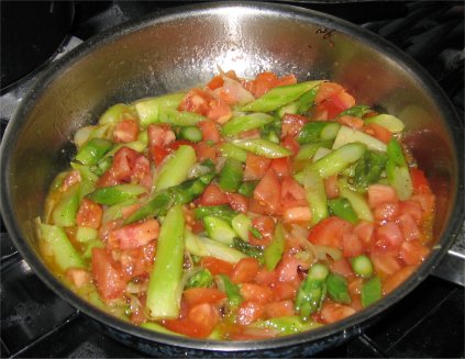 reife Gemüsetomaten in Würfel schneiden, blanchierter Spargel in Stücke schneiden