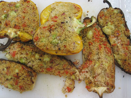Avocados halbieren, entkernen, Fruchtfleisch herausheben und in 1.5 cm breite Streifen schneiden. Salat,Koriander und Avocados unter das geröstete Gemüse heben.